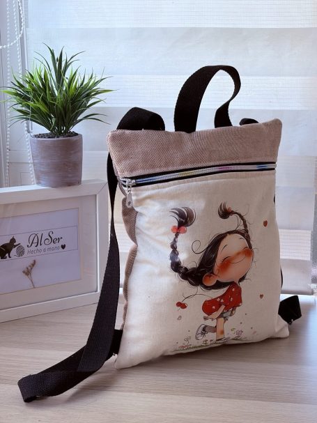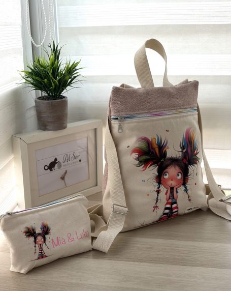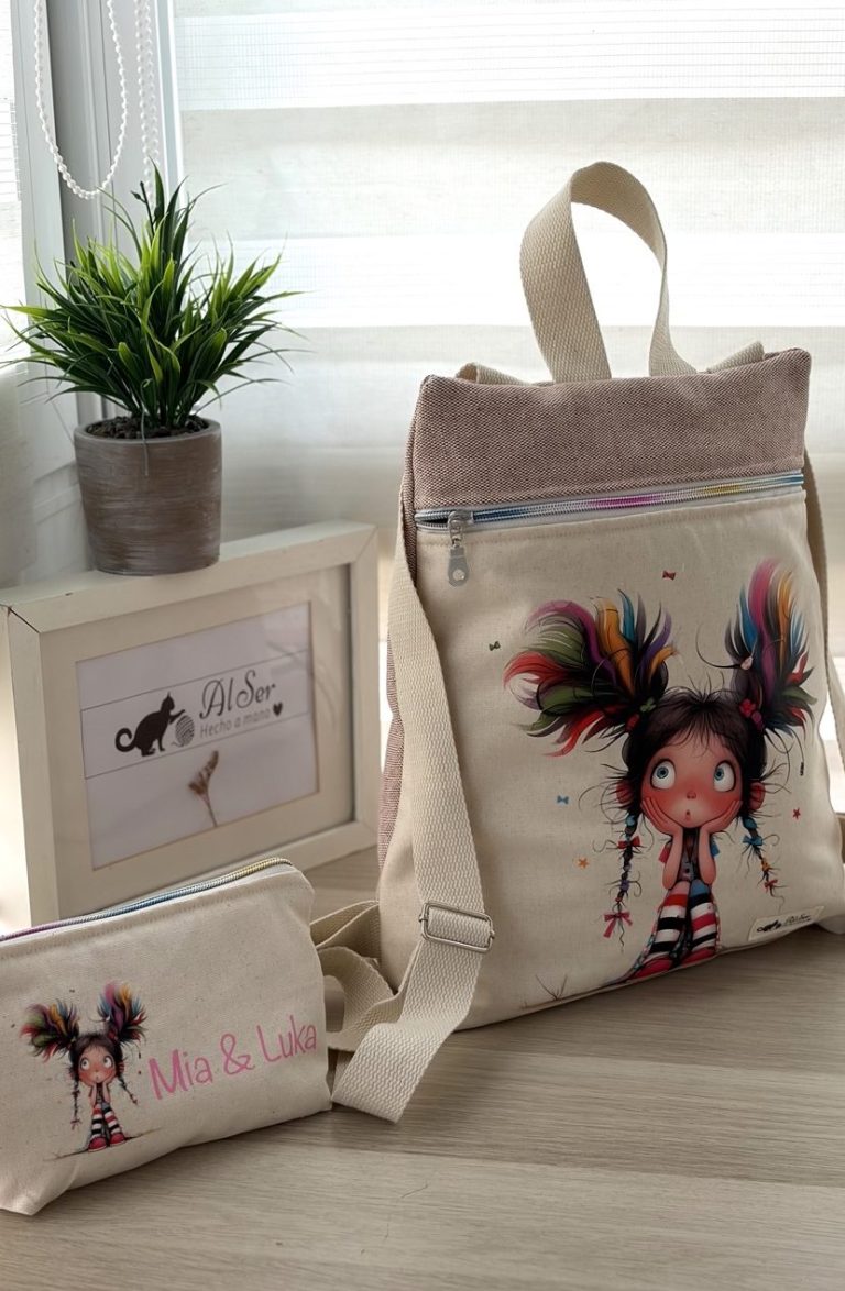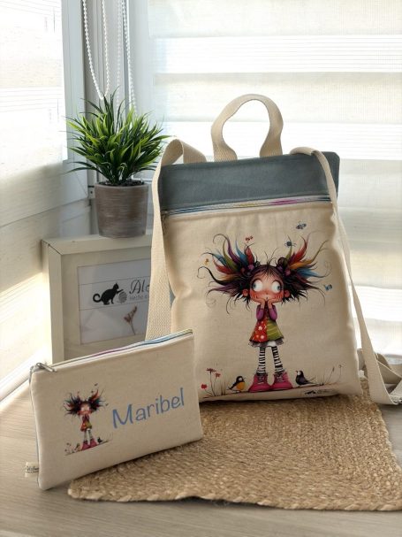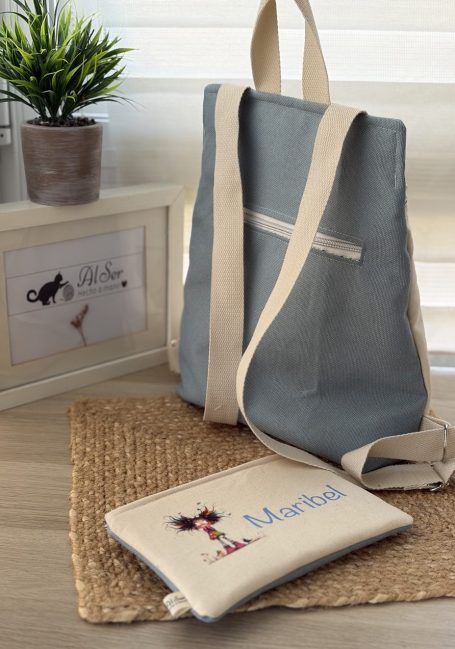 Mochila+monedero acolchado a juego, tanto en las telas como en la cremallera. Personalizado con tu nombre o el de la persona que se lo vayas a regalar
