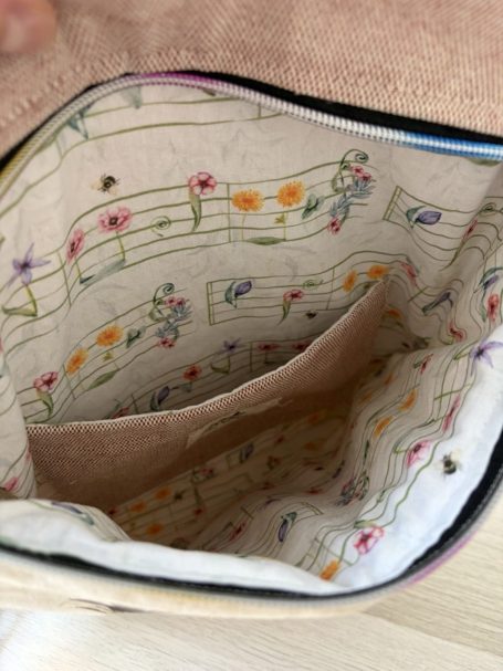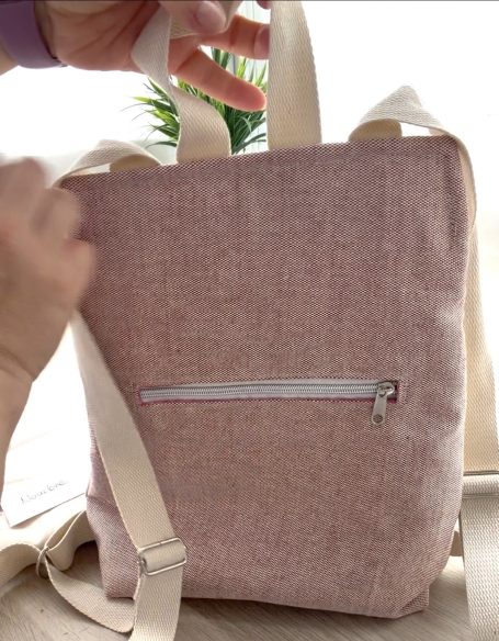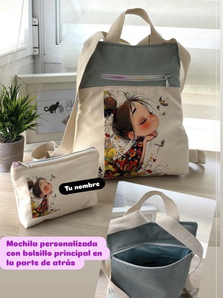 Mochila inversa con bolsillo pequeño delante y bolsillo grande detrás en modo seguridad. bolsillo interior amplio+ neceser personalizado con nombmre